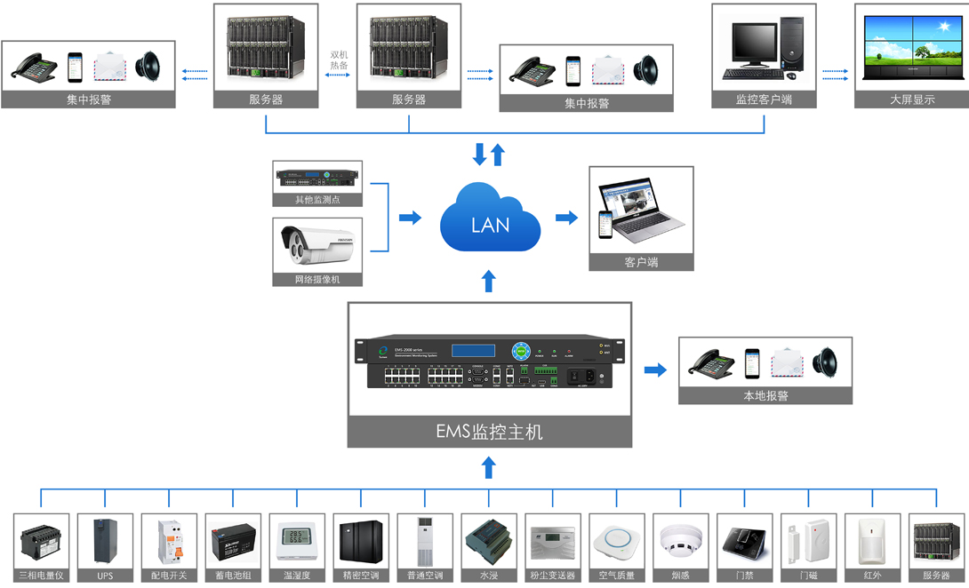 EMS系列監(jiān)控主機(jī)主要用以采集數(shù)據(jù)、處理數(shù)據(jù),可對環(huán)境、運(yùn)行負(fù)載、設(shè)備溫升、局放工況、安防、視頻、消防、智能設(shè) 備等進(jìn)行一體化監(jiān)控。在實(shí)際應(yīng)用中,與不同類型的傳感器相連,布線簡潔,操作方便。